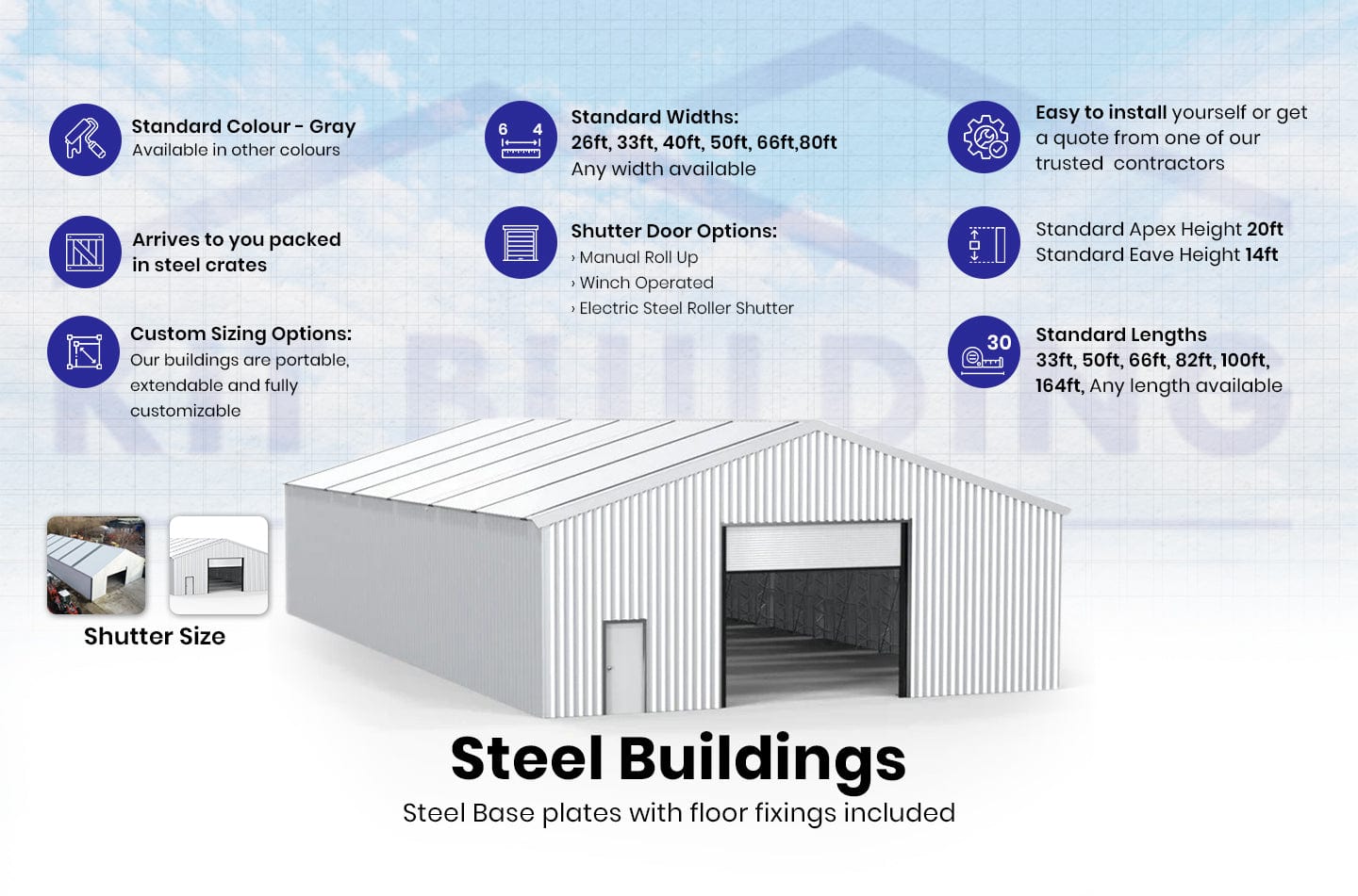 Ja, Kit Buildings' strukturer er tilpasselige. Du kan bruge vores Bygning Konfigurator eller kontakte os direkte for at specificere dine krav. Du har fleksibiliteten til at justere bredden, længden og højden, vælge placeringen af skodder og døre, vælge farver og beslutte om typen af isolering, der passer til dine behov for din stålrammebygning.